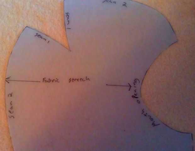 Importante! Al colocar el patrón en el paño grueso y suave de la cabeza, asegúrese de que el patrón está sentado en la tela para que la tela se extiende desde la parte delantera del títere a la espalda de la marioneta. No arriba y abajo. También asegúrese de que la "siesta" o "Grano" de la tela va a las mismas direcciones para ambas mitades de la marioneta. Otro sabio la costura será obvia no importa cómo usted cose juntos.