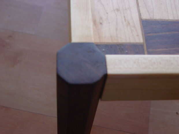 Mi mesa de centro minimalista es muy simple: Tomé algunos extra 2" amplia arce y dado'ed longitudinalmente por lo que la mesa cabrían perfectamente dentro de él. Hice 4 piezas de este arce, para cada lado. Para las piernas, tomé cuatro pares de tableros de nogal 1-3/4" y los laminados juntos (así tengo 4 piezas de pierna con una sección cuadrada) y convertido en octógonos con mi juntera (usted podría sólo guardar em cuadrados si no tienes uno). Finalmente he creado una hendidura (no sé el término técnico) en las piernas de la esquina de la mesa para caber dentro. Lo hice manualmente, utilizando un martillo y cincel. Puede haber una mejor manera, puesto que parecía mantener saltar de la parte superior de la pata de la mesa (la parte que sobresale sobre la superficie de la mesa). No era demasiado malo, ya que pude sólo volver a pegar, aunque.