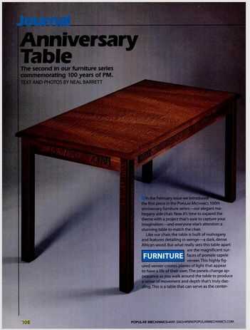 Los paneles cambian apariencia al caminar alrededor de la mesa a producir una sensación de movimiento y profundidad que es realmente deslumbrante. Se trata de una tabla que puede servir como la pieza central de una habitación o como un acento a la decoración de una ya establecida. Si lo usas como una mesa de comedor, se lo asiento cómodamente adultos de cuatro a seis. Chapas de sapele wenge y Pomeles están disponibles de varios distribuidores de madera de pedido por correo. Un tal proveedor es A & M madera especialidad Inc., 358 Eagle St. N., caja 32040, Cambridge, Ontario, Canadá N3H 5M 2; 800-265-2759; www.amwoodinc. com Además de la chapa de madera adornada, necesitarás una pequeña cantidad de chapa caoba lisa por la cara inferior del panel superior de la tabla. Nuestra tapa de la chapa calculado se compone de varias hojas colocadas borde a borde. Usted encontrará que las piezas individuales se venden en la secuencia que está cortadas desde el registro. Este le da control sobre el patrón repetitivo creado por las hojas de chapa montado. En nuestra mesa, utilizamos un patrón partido de libro, en el que cada otra hoja de chapa se volcó para crear una imagen espejo de la hoja adyacente.