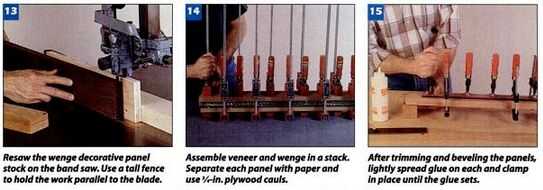 Entonces, pruebe la colocación de las espigas de delantal en las mortajas de la pierna. Marque la ubicación de cada tablero sujetador en los faldones de la mesa. Una guía para el taladro de la abrazadera y dio un receso de 3⁄4 pulg. de diámetro para cada sujetador (foto 12). Utilice la mesa de fresadora para cortar el cartabón a lo largo del borde inferior de cada faldón. Los paneles decorativos para el piernas y las faldas se hacen de wenge con caras de chapa de Sapelly Pomeles. Puesto que estos paneles son muy estrechos, hacer bastante amplia los espacios en blanco así que usted puede rasgar dos paneles de cada pieza. En primer lugar, cantear-los paneles de wenge (Foto 13) y plano de espesor acabado. Cortar las hojas de chapa del mismo tamaño que los espacios en blanco de wenge. Puesto que los paneles son pequeños, chapa se aplican a más de una pieza a la vez, luego la pila y sujetarlos juntos. Coloque la pila entre cauls 3⁄4 pulg. de espesor y aplique las abrazaderas (Foto 14).