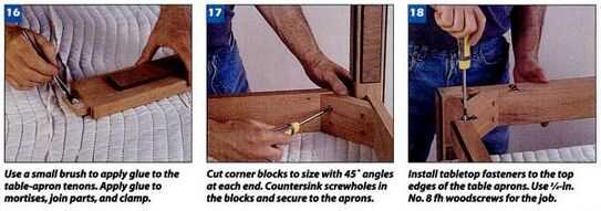 Repita el proceso para todos los paneles decorativos. Cuando el pegamento ha fijado, cortar los paneles a finales de la dimensión y los cartabones de la derrota como se muestra en el dibujo. Fijar un panel a uno de los delantales y ligeramente marca su contorno con un lápiz. Unte el pegamento en la parte posterior del panel, coloque en el delantal y aplique las abrazaderas (foto 15). Repita este proceso con los paneles restantes en cada plataforma y la pierna. Para armar la base, primero Unte pegamento sobre las espigas de un faldón largo (foto 16). Coloque una cuña para Unte pegamento en el apareamiento mortajas, Únete a las piezas, pinza y comprobar que el conjunto es cuadrado. Repita para el lado opuesto. Completar la base uniendo los delantales cortos a las piernas. Corte e instale los bloques de la esquina como se muestra en el dibujo (Foto 17). A continuación, agujerear los agujeros piloto e instale los sujetadores del tableros (Foto 18).