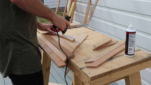 Establecer una buena línea ondulada de cola para madera y poner unas gotas de hotglue entre los garabatos, luego coloque la madera en el triángulo de la plantilla. La hotglue establecerá rápidamente, con eficacia 'drásticas' la madera y la seca de pegamento de madera dando un enlace mucho más eficaz que uno solo. Una vez que has hecho una plantilla completa, dale la vuelta y poner algunos pequeños clavos (o tornillos) de la parte posterior para garantizar realmente la madera a la plantilla. Repita este proceso para todas las plantillas de triángulo.