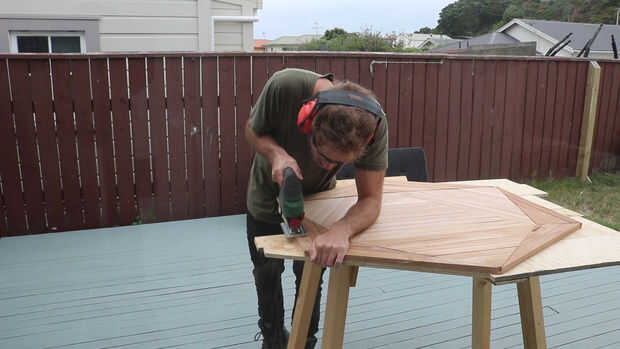 He utilizado piezas de 12mm de madera de desecho que tenía por ahí. Coloque los triángulos por la colocación de tornillos por la parte inferior de la placa de respaldo. A continuación ir alrededor del borde de la mesa y recorte de cualquier proyección.