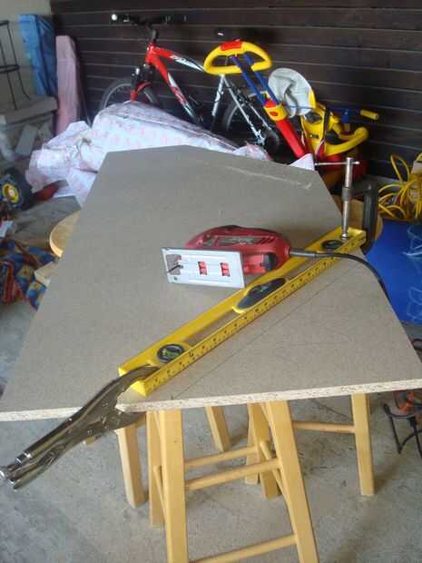 Tenemos que cortar la forma. Coloque el tablero sobre una mesa o soporte, utiliza algunos taburetes de barra y obtener su abrazaderas, Sierra y regla o nivel. Para hacer estos cortes tan rectos como sea posible usé un nivel reprimieron en el tablero como una guía para mi sierra. Primero coloqué mi sierra en la línea de que se corte. Luego tomó el nivel y colocado contra el borde de la sierra lo más recto posible hacia el otro lado de la línea a cortar. Ajustar el nivel. Ahora ve al otro lado de la línea y otra vez colocar la sierra en la línea a cortar y ajustar el otro lado del nivel para poner contra la sierra. Este lado de la abrazadera. Comprobar otra vez en ambos lados para asegurarse de que el nivel no cambio en sujeción. Ahora tienes una guía para una recta cortada. Vio de lejos y repita para las cuatro esquinas.