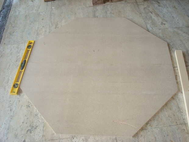 Comience por dibujar una línea recta desde una esquina a otra esquina. Hacerlo desde la otra esquina. Esto debe crear una "X" en el tablero y donde se intersectan las 2 líneas en el centro es el centro de la placa. A continuación medir la distancia entre el centro del tablero a una de las esquinas. No importa que rincón ya que es lo mismo todo. Anote este número. Para una tabla de 50 "x 50" la medida es 35 3/8". Tomar este número y medida de un lado de la Junta a la otra en el borde y marcar, ver foto con nota. Hacer esto para los 4 lados va hacia la derecha. Hacer la misma que va hacia la izquierda. En este punto cada arista debe tener dos marcas. Tome su borde recto y trazar una línea desde un punto a otro en cada esquina, ver foto con nota. Esto le dará la forma de octágono.