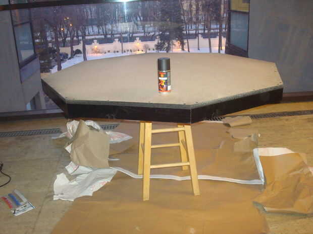 La parte más difícil se hace y es en la part...painting fácil. Colocar suficiente papel en el piso para cubrir la mesa y luego algunos. Su pintura de aerosol negra mate del gancho agarrador y empezar en un lado. Cuando vaya de un extremo al otro extremo de la punta de pulverización suficientes veces para sólo cubren el lado uniformemente. NO spray o se te gotea. No te preocupes puedes ver la madera todavía. Esto es sólo 1 capa de 3. Utilice el mismo procedimiento en todos los lados y deje secar por 30 minutos. Prueba si seco y agregar la segunda capa usando el mismo procedimiento. Repetir al menos 3 capas, más si es necesario.