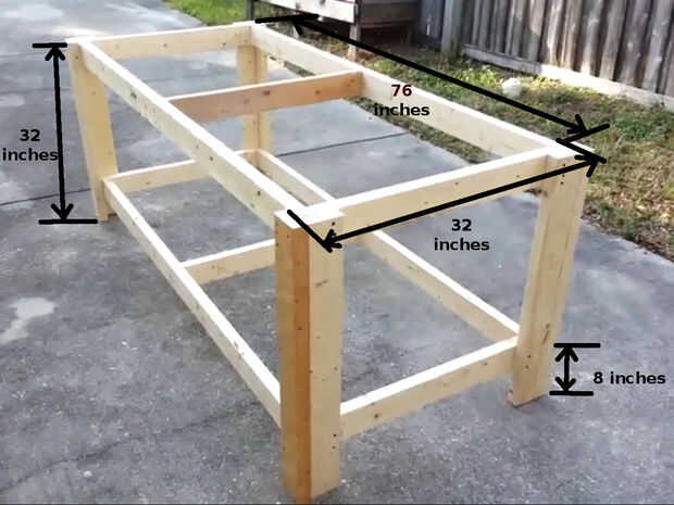 El marco de la mesa de trabajo se compone de dos rectángulos 76 pulgadas de largo, por 32 pulgadas de ancho de 2X4s y cuatro patas 32 pulgadas de largo, también de 2X4s.