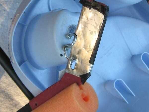 Originalmente usé tornillos de ojo redondo para la conexión, pero gira sobre un eje y cayeron el plástico por lo que tengo algunos pesados pernos en forma de U que se quedó mucho mejor y nunca se movió. Puse un llavero por la cabeza del palo de hockey reforzado y luego conectarse el perno en u en cada uno de los cuatro brazos