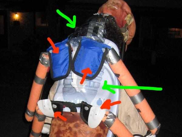 En los omóplatos, que arrancó algunos de relleno de algunos viejos pantalones de hockey y paleta formas empernando justo a las cabezas de los palos de hockey (flechas rojas). I cortar una botella de watercooler mitad y atornilladas en el babybath en la parte posterior para hacer el cuerpo más de un jorobado (flechas verdes) después de empujar un gran pedazo de espuma de poliestireno debajo de él para sostenerlo vertical.