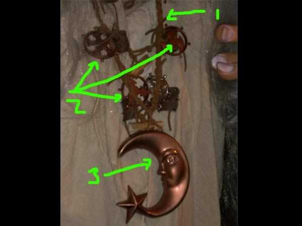 Necesitaba más ornamentación así que hice un collar largo con sobras de cordón de cuero (1) por trenzado 3 piezas juntos unos 2' de largo. He encontrado una luna grande de plástico (3) algunos discos de juguete con centros limpios (2) que aerosol-pintado cobre como los otros adornos.