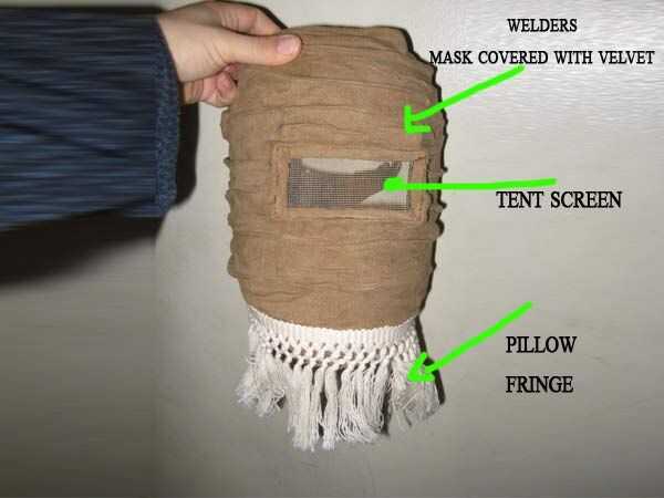 me gustaba mi mostrando cara y estaba realmente harto de tragar trozos de pelo, así que necesitaba una máscara que me permitía ver, pero no deja pelo llegar a ninguna parte cerca de mi cara. Compré una máscara de soldadores, sustituye el vidrio por acampar pantalla y cubierto con ultra-suede con pegamento caliente. Corrí algunos flecos arrancado una almohada vieja alrededor de la base con pegamento caliente para ocultar la interfaz de camisa de cuello. Esto salió bien, porque llevo gafas y podía usar la máscara y las gafas al mismo tiempo. Recomendaría una correa de las gafas, porque todos en el bar agarra la nariz de la mística y agita golpeando te un poco.