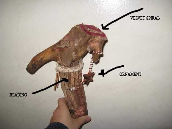 Místicos suelen llevan un personal. Encontré una bonita rama nudosas y había añadido algunos abalorios algunas espirales de terciopelo y un colgantes estrellas en el mango. Poner más remolinos a lo largo de la longitud y aerosol-pintado ligeramente con cobre para que coincida con todo lo demás. El personal le ayuda a encontrar el piso en la oscuridad, en aceras y escaleras en lugares oscuros. También es bueno golpear a idiotas con que agarrar la nariz de la mística y agitar alrededor.