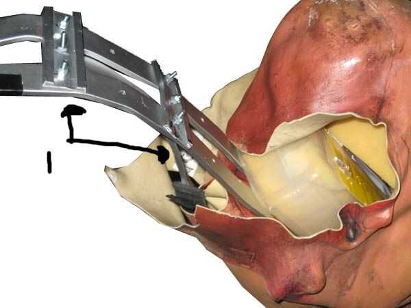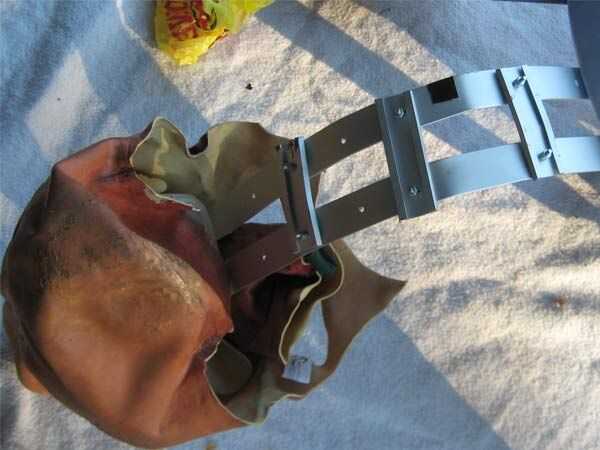 Añadir una tercera tira de aluminio (ver 1) aproximadamente 1.5' de largo para apoyar el interior de la mandíbula (antes el oído), una botella de plástico del tamaño de la máscara principal del perno a la parte superior de las tiras del 2 marco y tire de la máscara, luego llene con pedazos de espuma de colchón camping hasta que la máscara se rellena sólidamente.