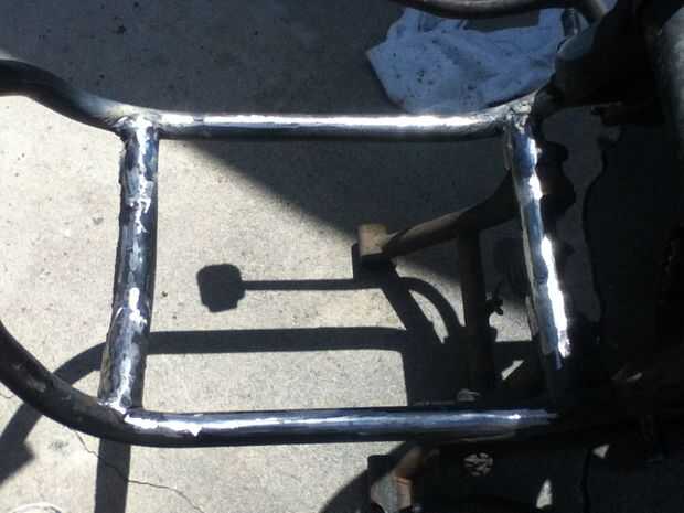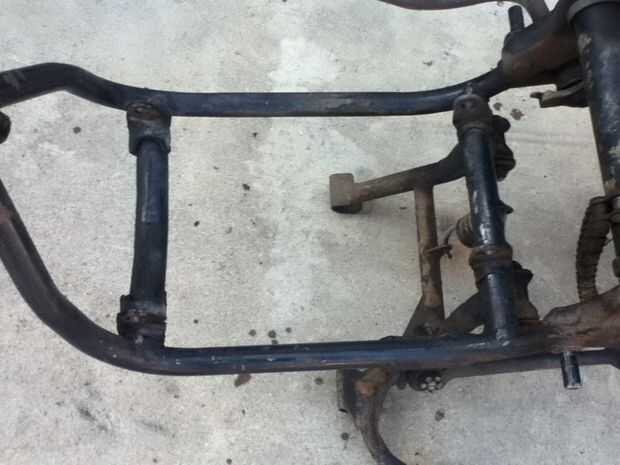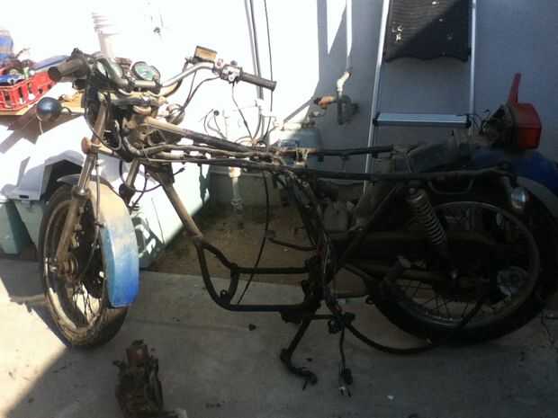 En este momento necesitará de hielo la moto. He marcado en el marco donde el piñón del motor se encontraba por lo que pude poner el nuevo motor eléctrico y el piñón en relativamente el mismo lugar. Necesitaba soldar los soportes de motor, baterías y controlador por lo que he quitado casi todo. Usted puede ver que yo la moto hasta el marco, ruedas y cadena. Tomé un montón de imagen de los cables con la esperanza de reutilizar algo de él más adelante. Puedes tomar todo lo de la moto en este momento si desea que la capa del polvo o pintura de la estructura. Sólo tocó la pintura y dejó negro como no quiera la molestia de sacar cada pieza de la bicicleta sólo para tener una pintura perfecta. En este momento había reconstruido el cilindro maestro del freno delantero.