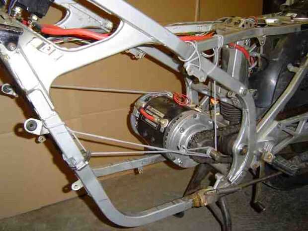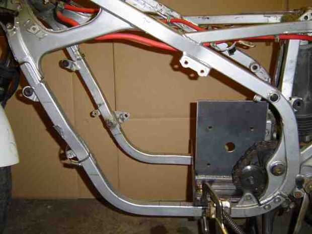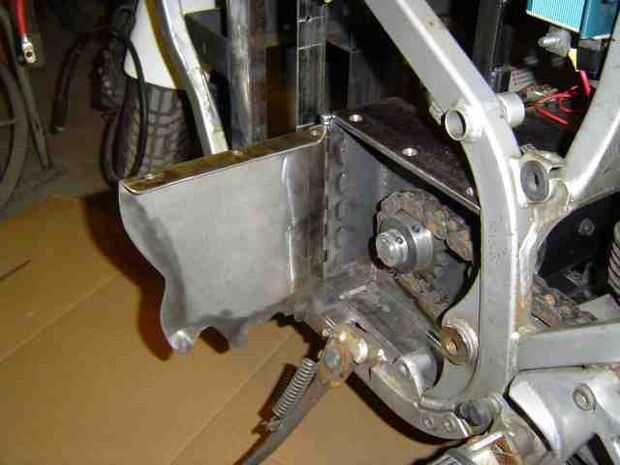 Ahora para la parte más difícil. Necesita una caja de batería segura y montaje del motor. Tuve un amigo soldar para mí e hicieron un trabajo fantástico. En las fotos puedes ver que primero encadenado el motor para permitir ajustes menores hacer antes de cortar la placa de montaje del motor. Después de que fue cortado hizo un agradable recinto cadena y el piñón con una puerta y había soldada en el chasis.