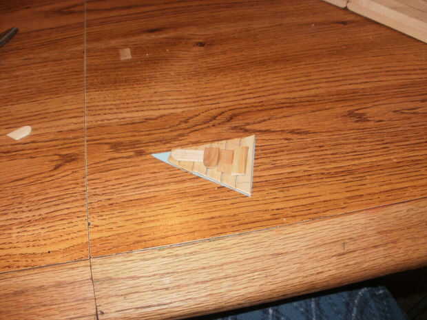 Ya que claramente iba a ser muy personalizado que forma involucrado, decidimos hacer primero una plantilla de papel. La forma más sencilla de hacerlo es poner un trozo de papel debajo de la nave y traza las paredes internas del triángulo de área de arco en la página. Recórtalo y luego colóquela en su lugar en la parte superior de la proa. Debe estar perfectamente en las piezas de la bisagra superior; Si no es así, ajuste según sea necesario. Etiqueta de la parte superior de la plantilla en caso de que el triángulo no es perfectamente simétrica.