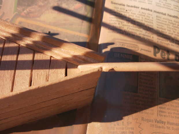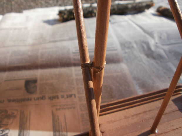 Una vez que todos los astilleros están en su lugar, aplicar una cucharada de pegamento para gota a gota en a los bits tirante entre los postes y yardas. Permita configurar un poco y aplica más según sea necesario para llenar los vacíos. La idea aquí es simplemente añadir un poco de refuerzo con el pegamento.