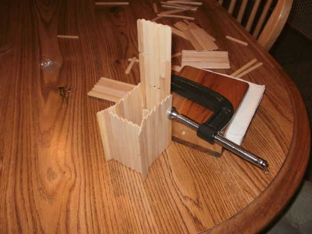 La quilla en punta de pie y usando la cubierta superior como espaciador (no pegan) para mantenerlo todo cuadrado, pegar las paredes a la quilla. Hemos volteado las paredes para que la barandilla de la escalera estaba sobre la mesa y coloca una saludable línea de pegamento a lo largo de la plataforma de pequeño ángulo en la parte "superior" como esta gemelas esquina con la superficie de la quilla cuando está montado. Luego apliqué la abrazadera para mantenerlo todo junto durante la noche antes de hacer nada más con esta sección. Quería asegurarse de que era sólido antes de trabajar con él.