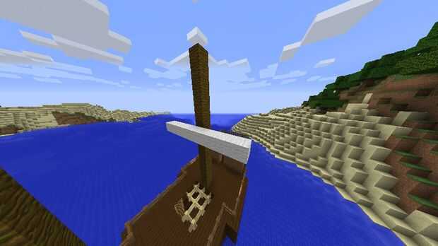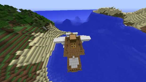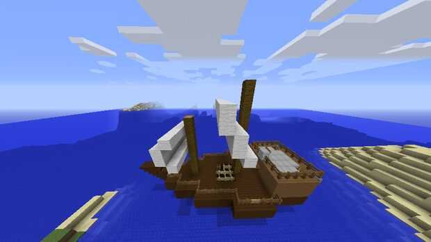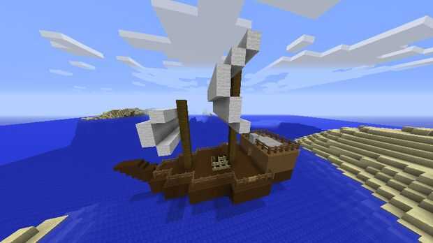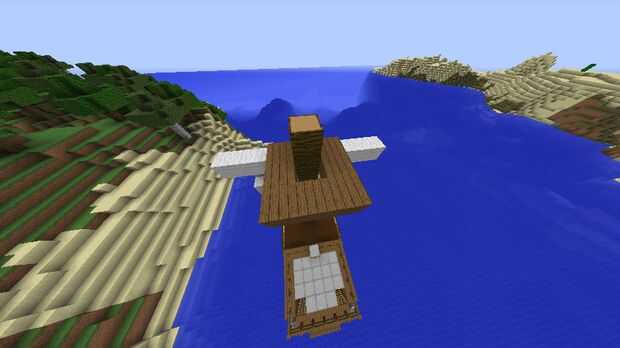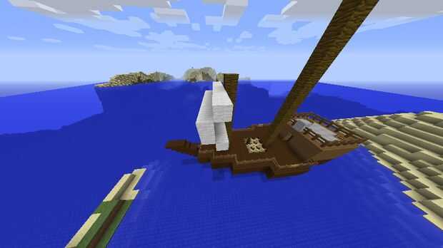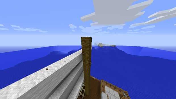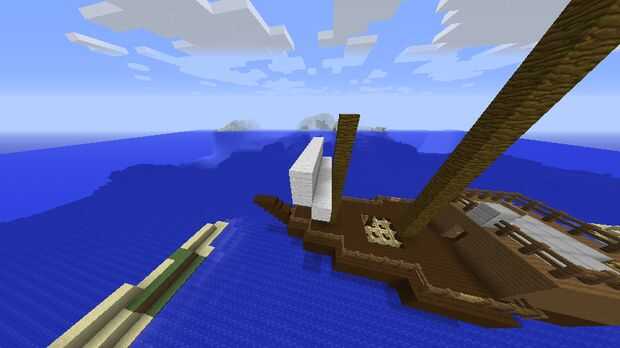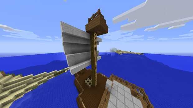 Ahora quiere crear dos mástiles en la cubierta. Hacer un pilar más cercano a la cabina 14 bloques de alta y un segundo pilar más pequeño 6 cuadras en frente del primer pilar. Hacer 10 cuadras de alta. Ahora, quieren construir la vela en el mástil más pequeño. Hacer que vaya tres bloques como se muestra arriba, y por supuesto una cuadra en el centro. Entonces, dos cuadras, hacer lana ir para arriba como se muestra en la imagen. Finalmente, rematar con una sola tira en la parte superior del mástil. El segundo mástil es muy similar, así que ninguna explicación es necesaria. Cuando haya terminado la vela, debe construir el mástil mayor a dos cuadras. Luego construir bloques que rodean la parte superior del mástil y puso "carriles" (guía). En el centro, poner una trampa y agregar escalera bajando todo el camino.