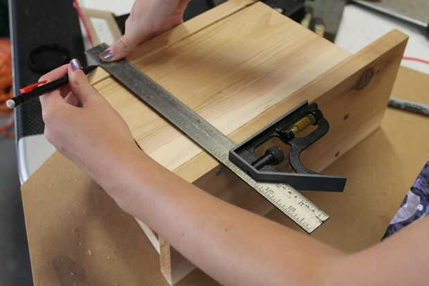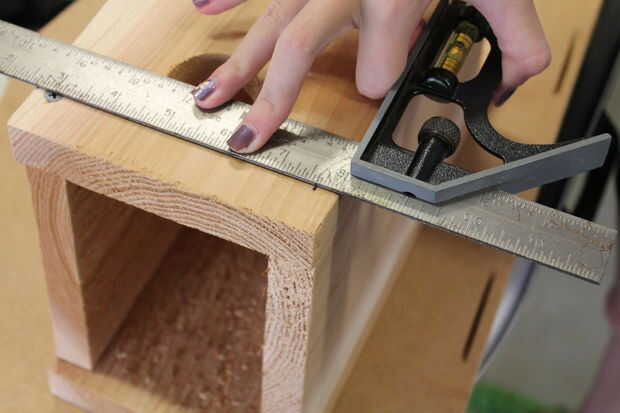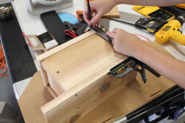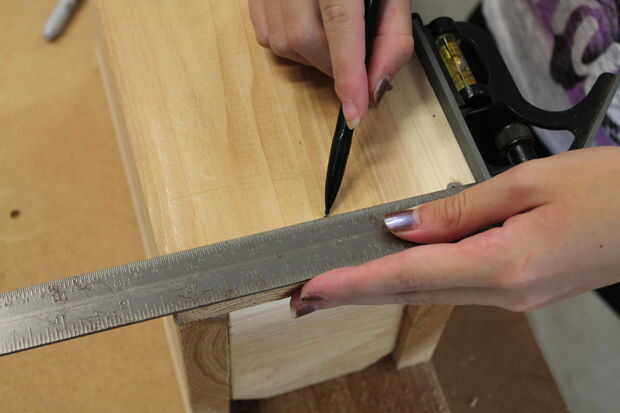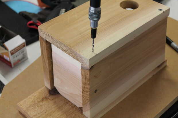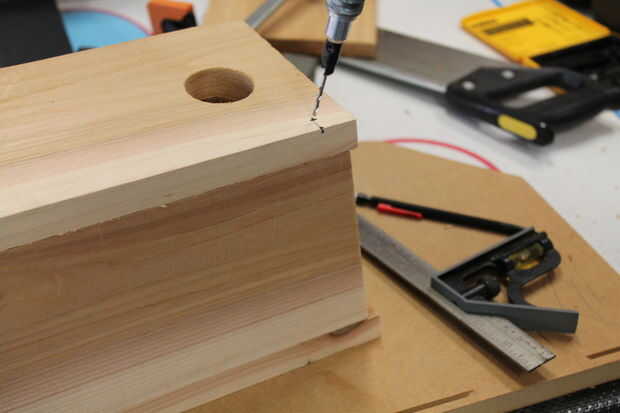 Coloque la pieza frontal de manera que el borde superior es ~1/4 "superiores a los lados (una vez más, esto es para la ventilación y para el lado que hace pivotar). Comience colocando la parte superior de la parte delantera a la derecha, con la plaza a alinear y marcar la posición como se muestra en las fotos. Luego perfore un agujero piloto y atornille un tornillo.