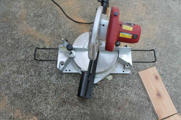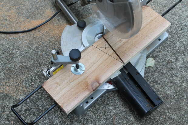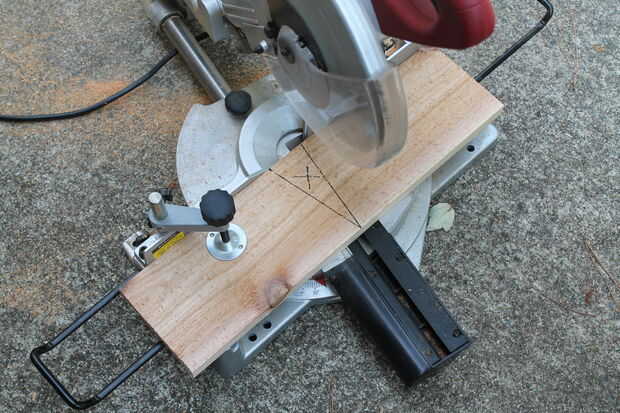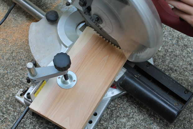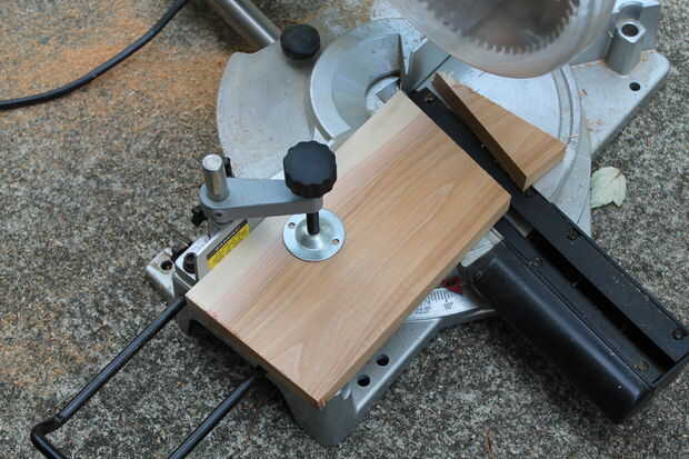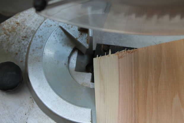 A continuación, a hacer dos cortes angulares, que son necesarios para que el techo inclinado de la pajarera puede caber en correctamente. Ajuste la sierra a un ángulo de 10 grados y hacer el primer corte como se muestra. Luego voltee la tabla y hacer el segundo. Usted lo dejó con un pequeño triángulo de madera de desecho, que acaba de lanzó hacia fuera, pero si quieres encontrar una forma de reutilizarlo, vaya le!