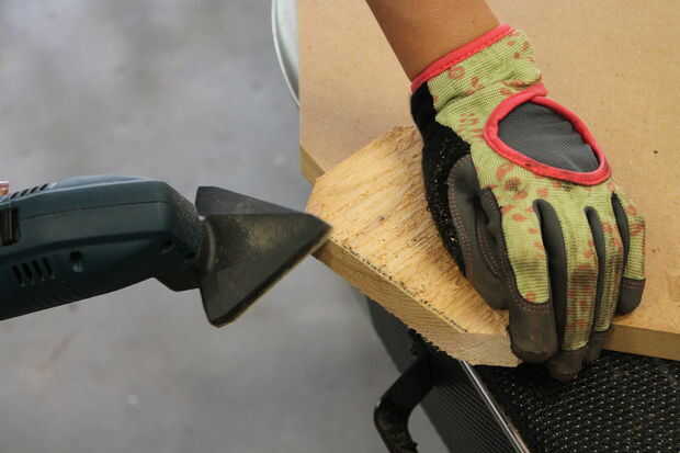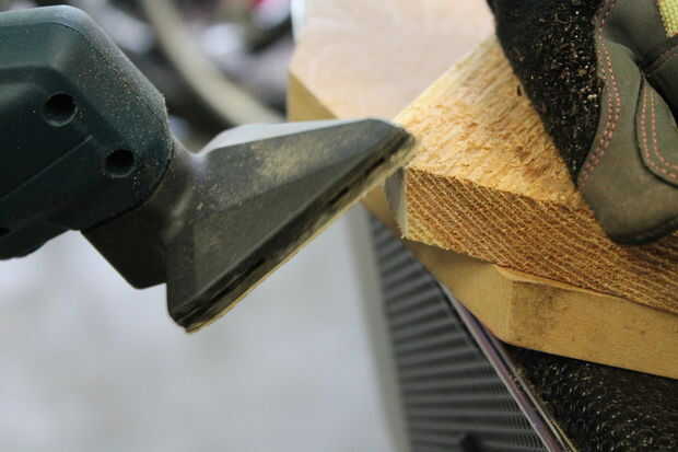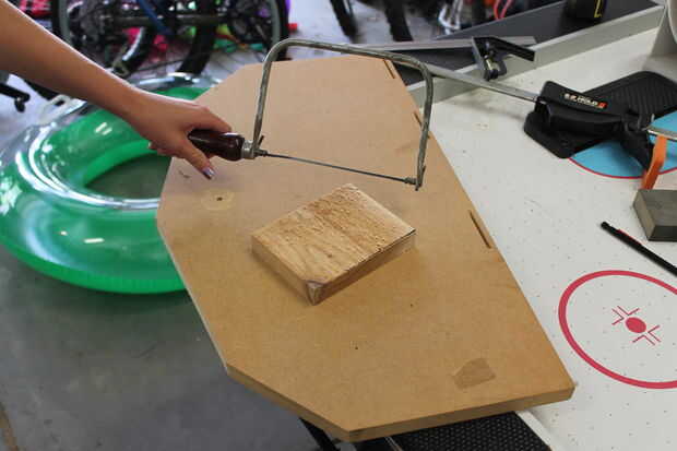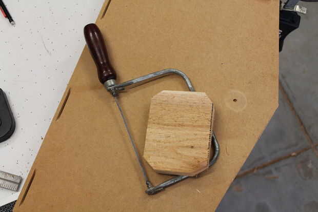 A continuación, voy cortando las esquinas su trozo de la parte inferior. Esto es para permitir el drenaje de cualquier acumulación de agua que ocurre en. No hay ninguna medidas específicas para éste; Fui por un poco más grande que 1/4" a cada lado. Solo marca donde usted podrá cortar y tratar de tenerlos todo incluso. Luego, utilizando una sierra de marquetería, cortar las esquinas! Fui con una lijadora de detalles a continuación y suavizada por las asperezas.