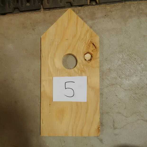 En la pieza número 4 o 5, hacer una marca de 6" de la parte inferior y en el centro. (¡ Por supuesto! ¿Quién quiere un agujero irregular?) Taladro con una broca hueca de 1 1/4" o 1 1/8".