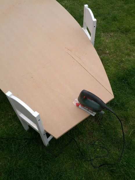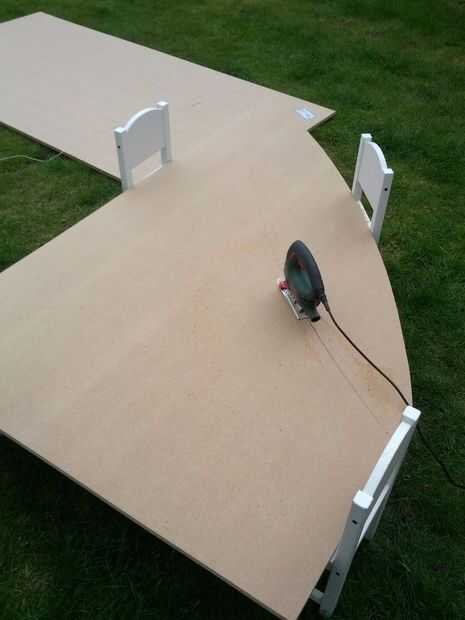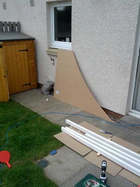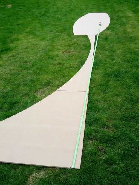Esta es la mejor hecha usando un rompecabezas. Una vez que se corta la curva en cada pieza toma el corte pieza y utilizarlo como plantilla para dibujar la pieza de la imagen del espejo en la misma hoja de la madera. Luego corte demasiado. Así que cada una de las dos hojas producirá dos secciones idénticas de la pared curva. La sección media de la curva, ya que es un disolvente, tendrá un mayor tamaño de corte y esto se puede utilizar para la tercera y última sección de la curva. Así que usando esta cortada puse menor y medianas dos curvas hacia abajo sobre la hierba con el corte apagado en la parte superior y utilizando el lápiz otra vez dibujó la sección curva final tomando la sección de la pared hasta la altura final de 14 pies. Otra vez corte la sección final y utilizado como una plantilla para hacer la imagen del espejo.