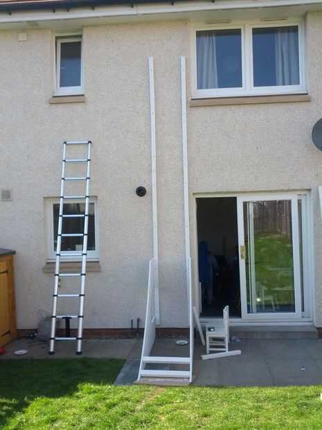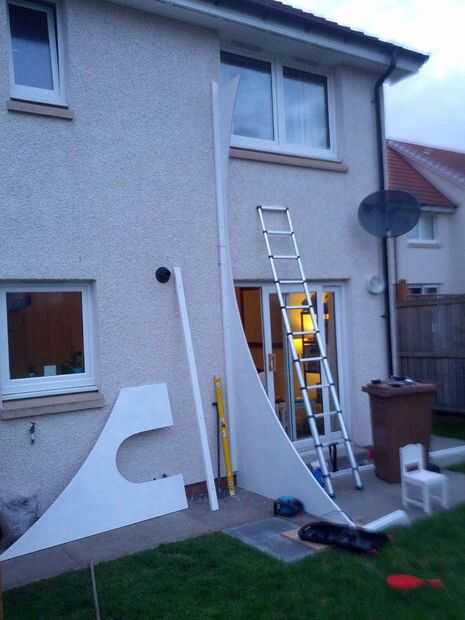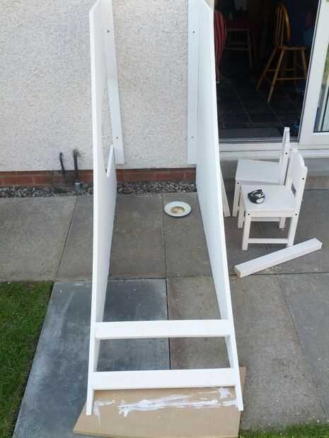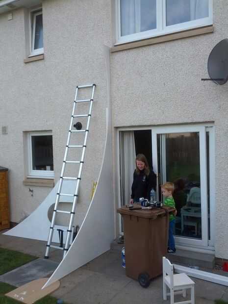 Primero até la madera CLS al lado de la casa. Dos largos separan por 600mm. Es 600mm de ancho porque entonces solo necesitas una hoja de madera contrachapada, corte por la mitad a lo largo de la superficie de la rampa de la hoja. Mantener bajos los costos. 600mm es todo lo que necesita acumular. Nunca he sentido la necesidad de una rampa más ancha. Una vez que la madera CLS se une a la casa los lados cortados de la rampa pueden ser adjunto a continuación. Corté un agujero en una de las secciones de la parte inferior para que mis hijos pueden usar como esconderse un poco.