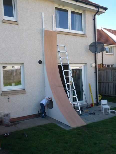 Las láminas de madera contrachapada era simplemente atornillado en las porras y luego pintado con una capa doble. La capa ha demostrado ser durable aunque la madera contrachapada de 9mm sólo ha sido bastante fuerte con las colocaciones de bastón cercano para soportar la fuerza de la ejecución de la rampa. He notado pequeñas fracturas en la madera en la parte inferior después de una buena cantidad de uso. Tal vez una madera ligeramente más grueso sería recomendable pero será mucho más difícil de doblar... por lo que es un trade off.