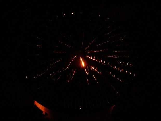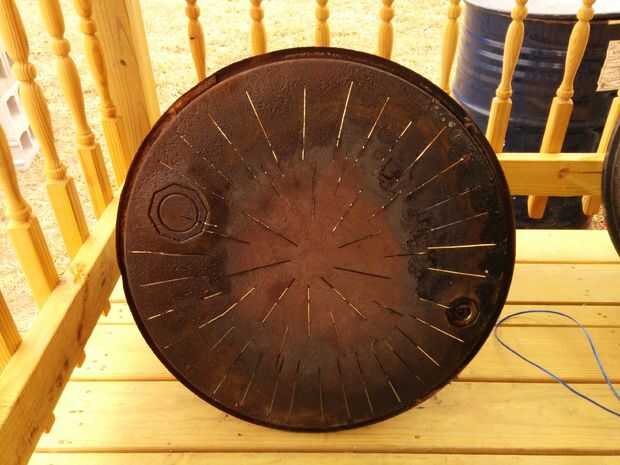 Utilicé una tapa del tambor de metal de 55 galones (Asegúrese de quitar todo el plástico y caucho) Utilice una rueda de corte y corte ranuras de 5" de largo espaciadas cerca de 1.5" aparte desde el exterior borde más. cortar ranuras 5" de largo y espaciadas 2 a 3" aparte cerca del centro pero no hasta el centro. luego cortar unas ranuras en la parte inferior de los mitad de camino entre el anillo interior y exterior