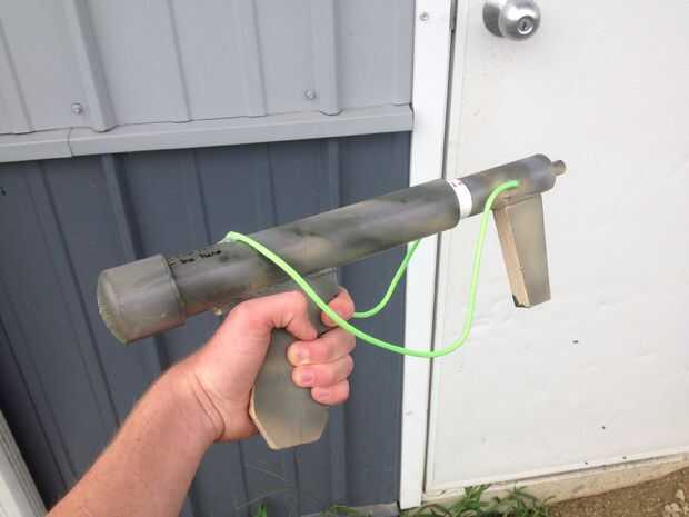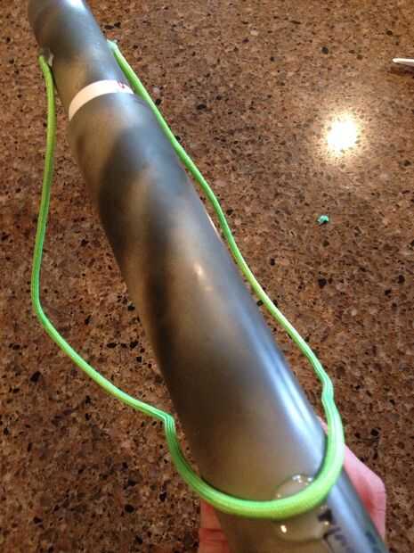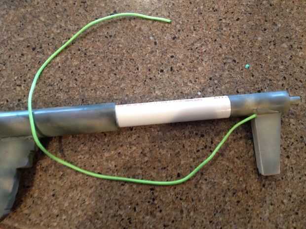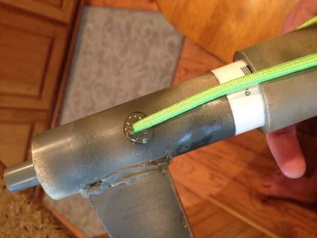 Este cable es solo para asegurarse de que nadie accidentalmente saca el cañón. Primer tirón del barril hacia fuera hasta pueda sin que perder estabilidad o la espuma que sale. Ahora corte una longitud de cable que plegada puede llegar a la mitad de la cámara de aire hasta el final del cañón. Ahora pegamento los dos extremos del cañón. Por último, tirar la mitad de la cuerda así sus y péguelo a la cámara de aire. Ahora el cable debe dejar de tirar de a lejos.