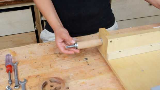 Ahora, vamos a conseguir el mango, coloque una arandela de 1/4 de pulgada, colocar el tornillo de la manija en el orificio de la rueda, agregar otra arandela y atornille sobre las dos tuercas de 1/4 de pulgada.