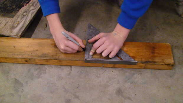 Alinee el 2X4s, toma la plataforma, alinean a un lado de 2X4s, marca el el otro lado de 2X4s con la marca para mostrar donde a serrar la madera adicional, utilizar la regla de ángulo recto para hacer las líneas rectas.