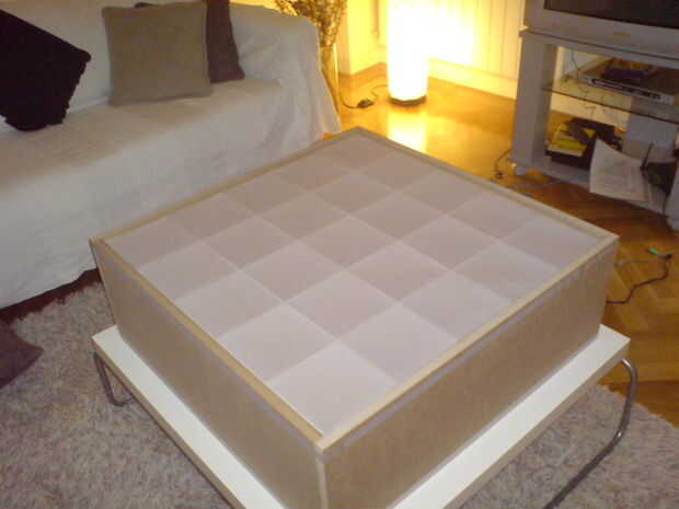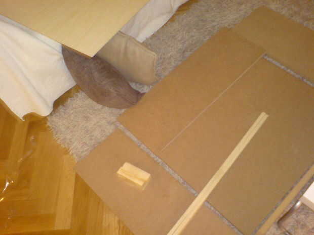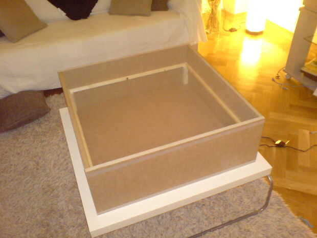 La estructura interna de la tabla, de la cual se suspenderá el vidrio se hace de MDF en mi réplica. Si alguien tiene la intención de construir uno, recomiendo una madera menos densa, ya que el MDF es muy pesado. Fue 19mm MDF grueso, creo. Lo compré en C/Madera en la ciudad de Madrid y fue bastante barato. Así que después de tomar todos estos a casa (la parte más difícil) verificado las dimensiones de todas las piezas uniendo los elementos con la cinta adhesiva.
