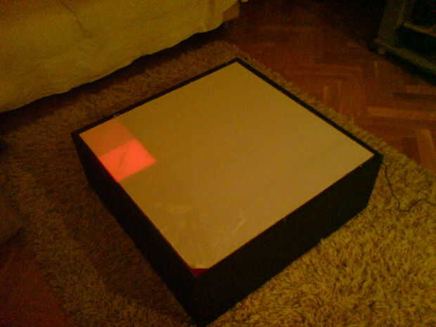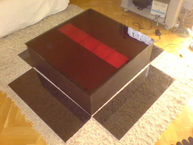 Tal vez una de las partes más arriesgadas de la construcción. Había cubierto la mesa con cristal 10mm gris. El vidrio fue unos 180 euros con los filos redondeados. La tabla original tiene algunas piezas de vidrio Unidas por pegamento, pienso, pero como mi mesa se estaba volviendo tan pesado quería un sistema para suspender el vidrio por lo que se podría desmontar. Hice esta modificación algunas perchas adhesivas y pintarlo de negro, hay cuatro ganchos para cada vaso vertical creo que el resultado fue bien tranquila. Ahora hay algunas fotos de la mesa sin el cristal y con él: