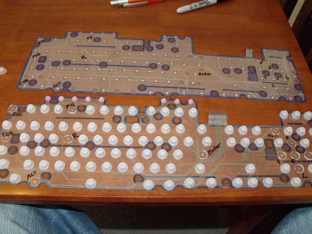 Desarmar el teclado y dentro encontrarás una pieza transparente delgada de película plástica. Es en realidad dos piezas que deben separarse. Después de hacerlo, tomar un rotulador y marque los contactos que corresponden a las teclas que desea utilizar.