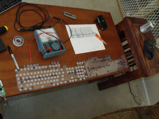 Ahora que tienes las teclas marcadas en las películas, tenemos que trazar los contactos y ver a que pin corresponde a que contacto. cada película tendrá su propio conjunto de pines. Un sistema será razón suficiente y la demás se abre. La película que es el recinto tendrá la menor cantidad de pines. Mi película de tierra tenía 8 pernos y la película abierta tenía 20 pernos. Por ejemplo: tomar la tecla R en el suelo y utilizando un polímetro en modo continuidad, saber que pin de 8 pernos conduce al contacto de la letra R. En mi caso fue pin 5. Hacer lo mismo para la letra R en el campo abierto muestra la tecla R corresponde al pin 11. Ahora sabemos que si hacemos los dos pasadores se toquen, que activarán la letra R. Es como funciona un teclado. Repita esto para cada tecla del teclado que vas a utilizar, haciendo una lista de esta información a medida que avanza.