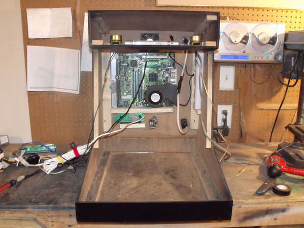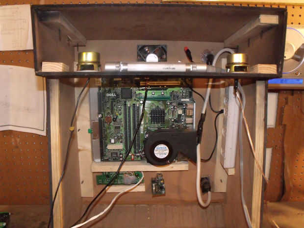 Tuve que llevar mi PC de la caja y montar los componentes en el gabinete. Hay un protector de voltaje dentro de la PC, monitor, altavoces y marquesina luz todo enchufe. Conecté este supresor de picos para el enchufe macho que se encuentra al ras con la parte exterior del gabinete. También puse un interruptor que enciende y apaga el supresor de picos. Esta manera, un interruptor controla todo.