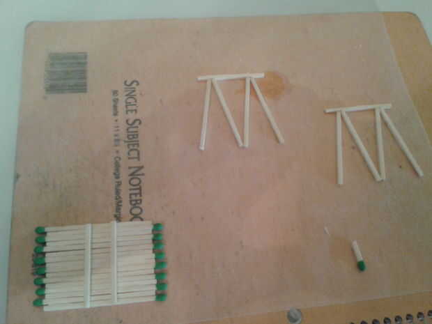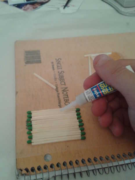 Para construir el asiento, colocar 16 partidos de lado a lado con la cabeza alternando. Colocar una línea de pegamento perpendicular a los partidos en el asiento y un partido de apoyo en el camino de pegamento que marcó. Esto proporcionará apoyo y mantener unida a la sede.