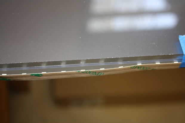 No necesita pulir las otras dos capas, y realmente recomiendo que sean ásperos así que luz IR no puede brillar en ellos. La capa de proyección trasera se debe colocar directamente sobre la capa EndLighten. Esta capa actúa como un difusor para el proyector, así que el proyector no simplemente brilla directamente aunque la superficie en el usuario. La capa resistente a la abrasión debe colocarse encima de la capa de proyección trasera. Esta capa es importante ya que protege a las otras capas más caras y es la capa que se tocarán el usuario real.