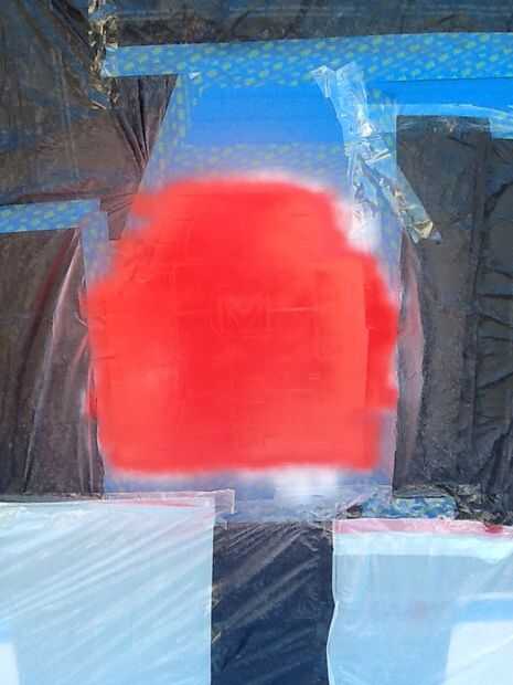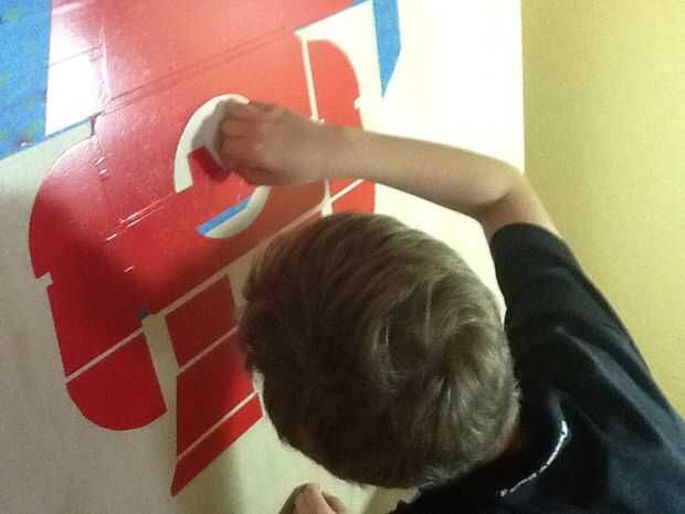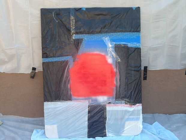 Entonces utilizamos la pintura de aerosol para las imágenes estarcidas, rojo, azul, amarillo y negro.