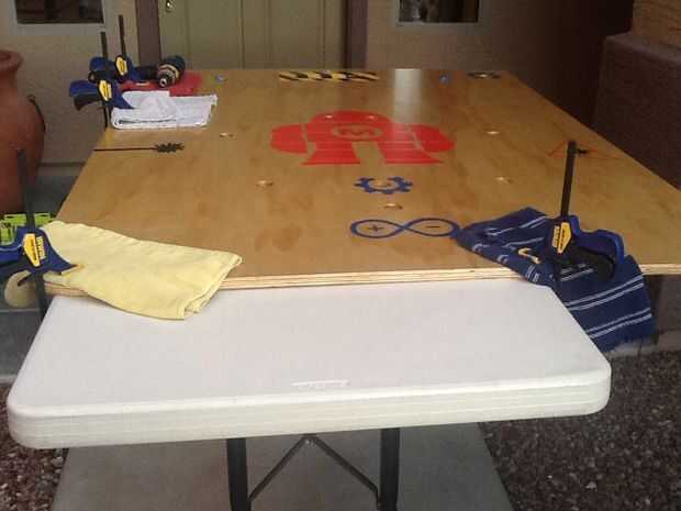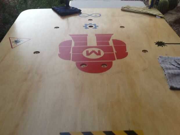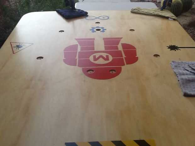 Hemos perforado los agujeros de 1 3/8 en la parte superior de la tabla para nuestros discos de plexiglass blanco que nos ilumina desde debajo con LED azul, hemos usado el uretano polivinílico y 4 abrigos aplicados a la superficie de lijado con papel de lija 400 entre capas.