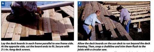 Una vez que se sujetan todas las tablas de la cubierta hacia abajo, usar una sierra circular para cortar sus extremos colgantes para que estén al ras con las vigas del perímetro. Ahora pasar a la terraza y comience la fijación abajo de las tablas de 2 x 6 cubierta. Otra vez, las placas de juntas a tope y hacerles correr mucho. Luego, coloque una chalkline (foto 7) y recortar las placas con las vigas.