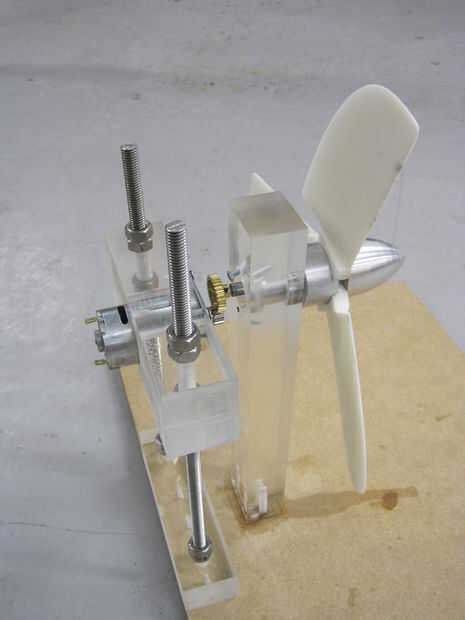 Debe asegurar el engranaje grande a la parte de 4mm del eje. Se utilizó un 4:1 cociente del engranaje del eje al generador.