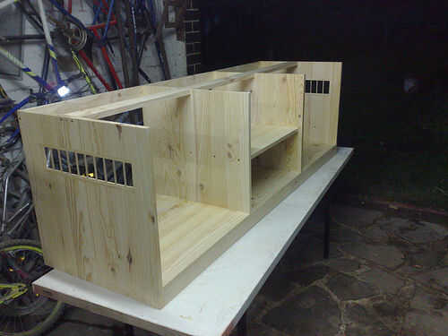 Planeé hacer un marco de madera para la base de ofrecer a poca altura y una estructura (para el estante inferior no sentarse directamente en el suelo, ni sag).