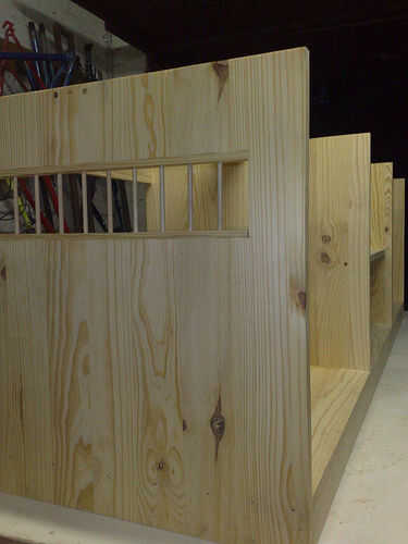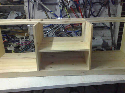Cortar muescas adicionales fuera del centro de los paneles con la sierra caladora, ranurada en otra pieza de madera de 7 cm x 1,6 cm en el centro de la parte superior y encolados/atornillados en lugar (véase la imagen de abajo - por desgracia la primera imagen que tomó realmente).