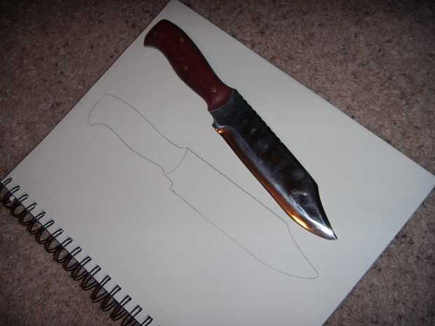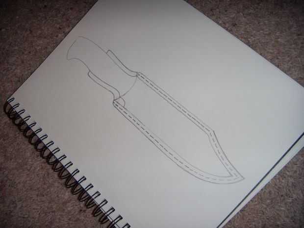 Paso número uno: igual que la última vez. Haz una almohadilla de papel y un lápiz. En primer lugar, la vaina tiene que acomodar la hoja de su cuchillo. Rastrear todo cuchillo, mango y todo, en el papel--véase el cuadro uno. Después de hecho esto, dibuje su envoltura alrededor de la cuchilla. SIEMPRE permitir suficiente espacio alrededor de la hoja para la expansión cuando el cuchillo está en la conexión de los lados de la vaina y vaina. Aquí voy a hacer un tipo de cuero capas de envoltura, una buena clase para principiantes como el cuero es más Clemente que otros tipos de material como madera o metal. Mi proyecto tiene tres capas, la parte posterior de la vaina, el panel frontal y un separador entre ellos. Dio aproximadamente un cuarto de pulgada de espacio (quizás un poco más en lugares) para conectar a todos. Por supuesto, este espacio podría necesitarse no si estás haciendo otro tipo de envoltura, como ante o vaina cosida a frente.