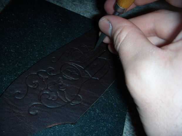 En primer lugar, empape su piel, como lo estoy haciendo en la imagen dos. Esto hace que sea flexible y le permite mantener un diseño. Dejar reposar en agua caliente unos quince minutos y cuando ese tiempo haya terminado, la almohadilla seca. Esperemos que por ahora ha elegido un diseño; Yo tengo la mía de th transferir el diseño ligeramente al cuero con el lápiz. No deja una marca de lápiz, por el contrario, dejará una impresión fina en la piel. Tratar de no cometer un error. Si, sin embargo, frotar y doblar la zona en cuestión hasta que la línea desaparece o se convierte en menos. Una vez que tengas tu diseño abajo puede empezar al cuero de la herramienta. Para una profunda impresión, presione la superficie de la herramienta en la piel sin moverlo. Para una impresión de profundidad media, arrastre la herramienta a lo largo de la superficie mientras aplica presión hacia abajo. Así, es fácil de dibujar líneas y filigrana fantasia como lo hice. Yo también Valensia dentro de mi diseño de la carta--es donde solo hacer puntos con la punta de la herramienta. Ver cuadro cuatro de dibujo y cinco para el punteado. Un video haría seguramente estas mejor, pero creo que usted consigue la idea. Cuadro 6 muestra el cuero después de herramientas. Déjala secar antes de ir al siguiente paso.