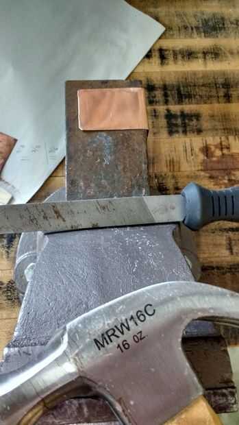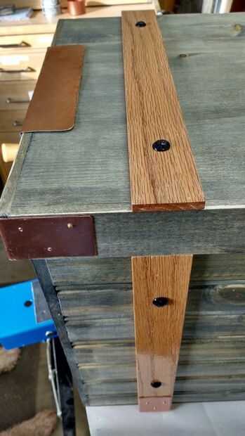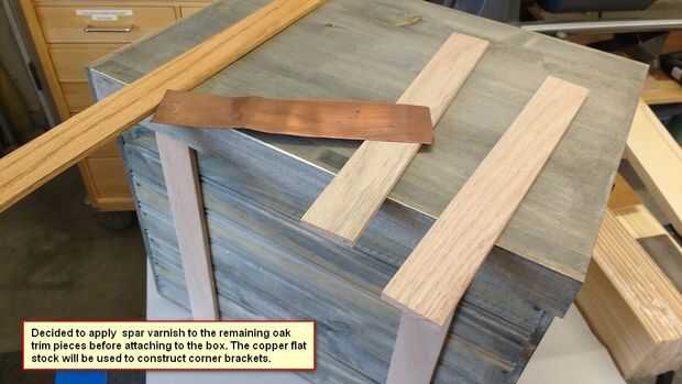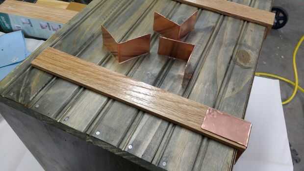 Los soportes de 8 esquina corte de la hoja de cobre, 1 3/8 "X 4" y doblados antes de recibir una capa de laca del aerosol. Esto reducir la oxidación del cobre y mantenerlo brillante. Ellos fueron Unidos con clavos de latón de ½".